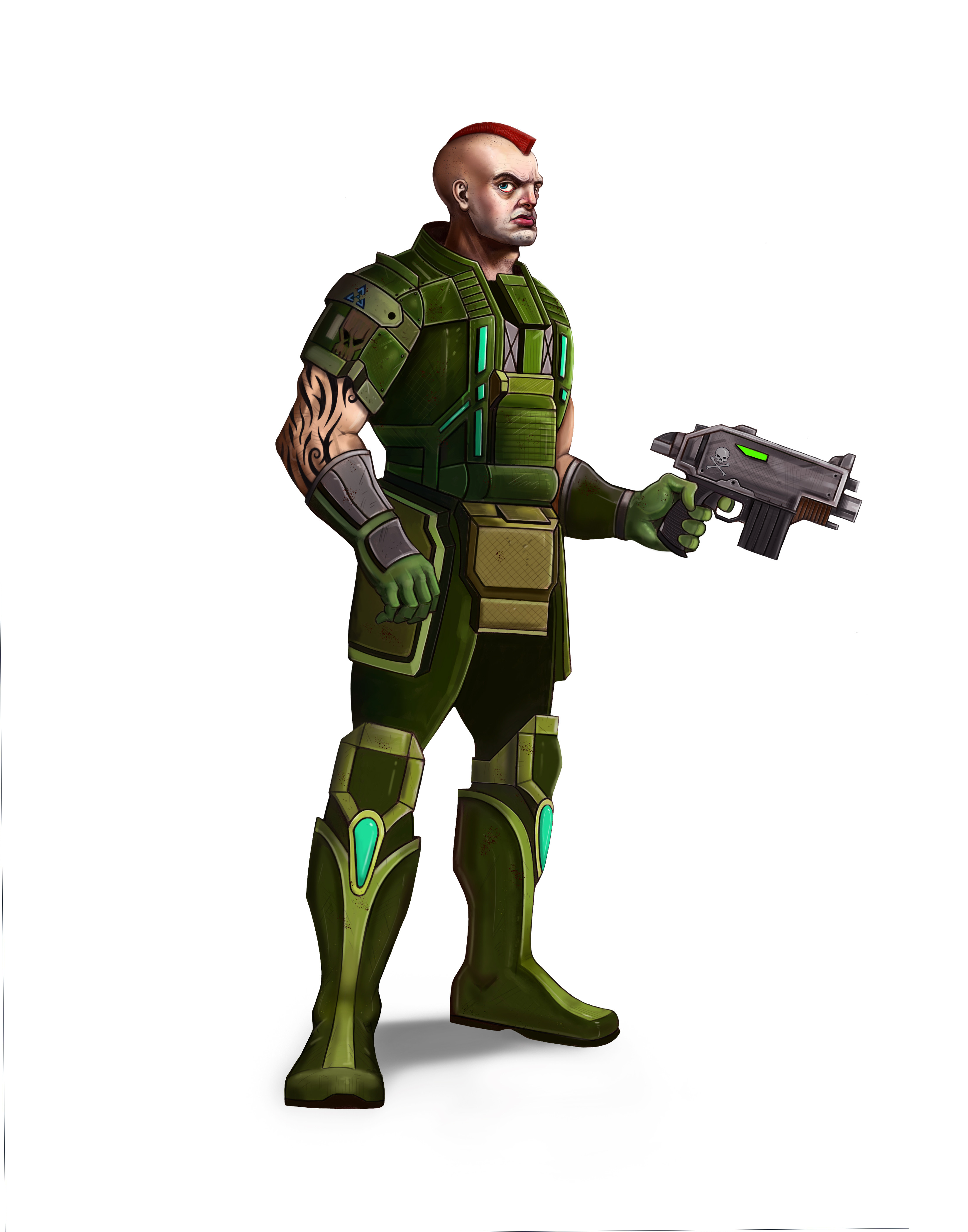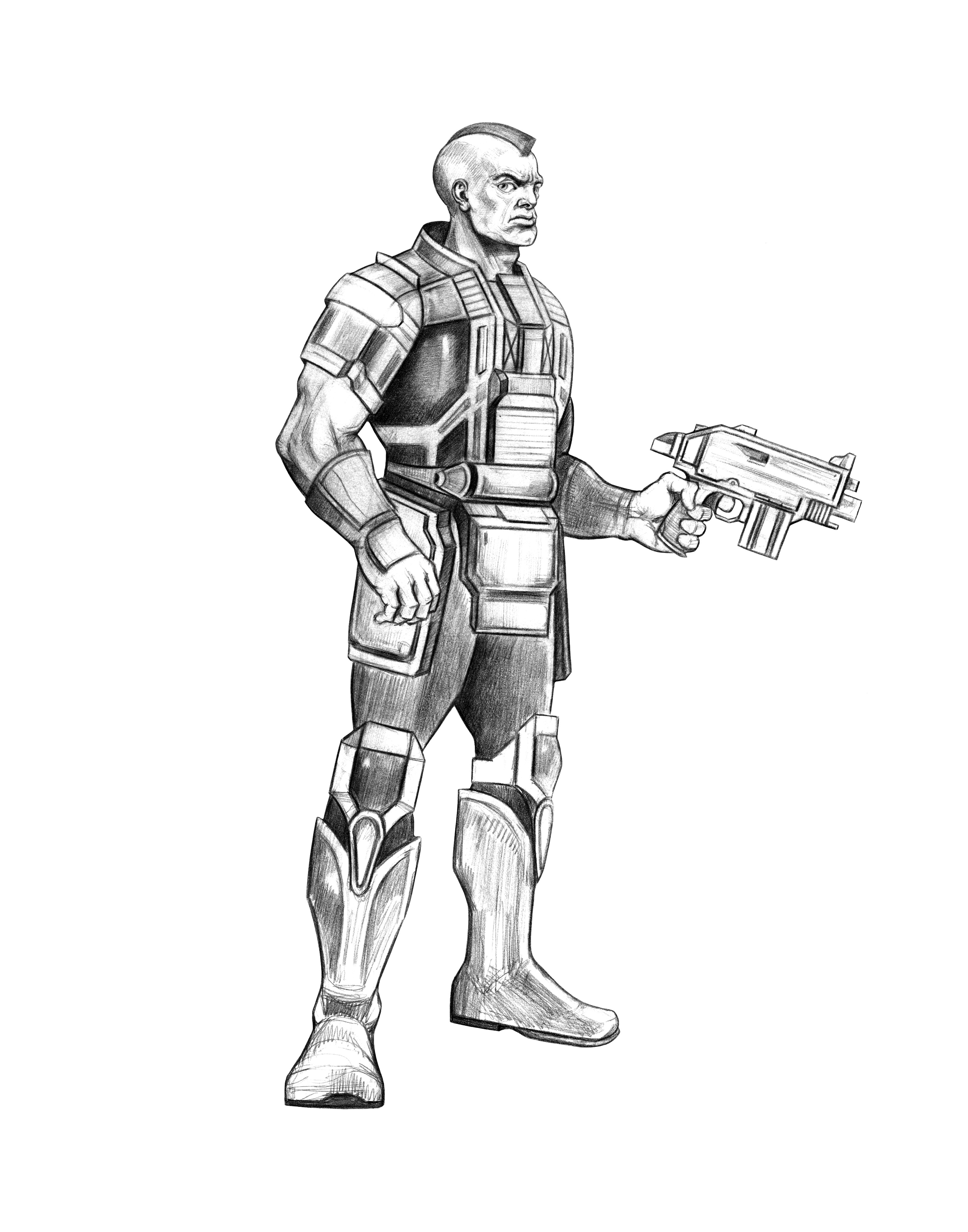 For this character, I was going for a space marine type character with heavy armor for dangerous alien encounters. The character is a veteran of many space missions and he is an experienced space marine. He works with a group of other space marine veterans and prefers to be on the front lines where the most action is.