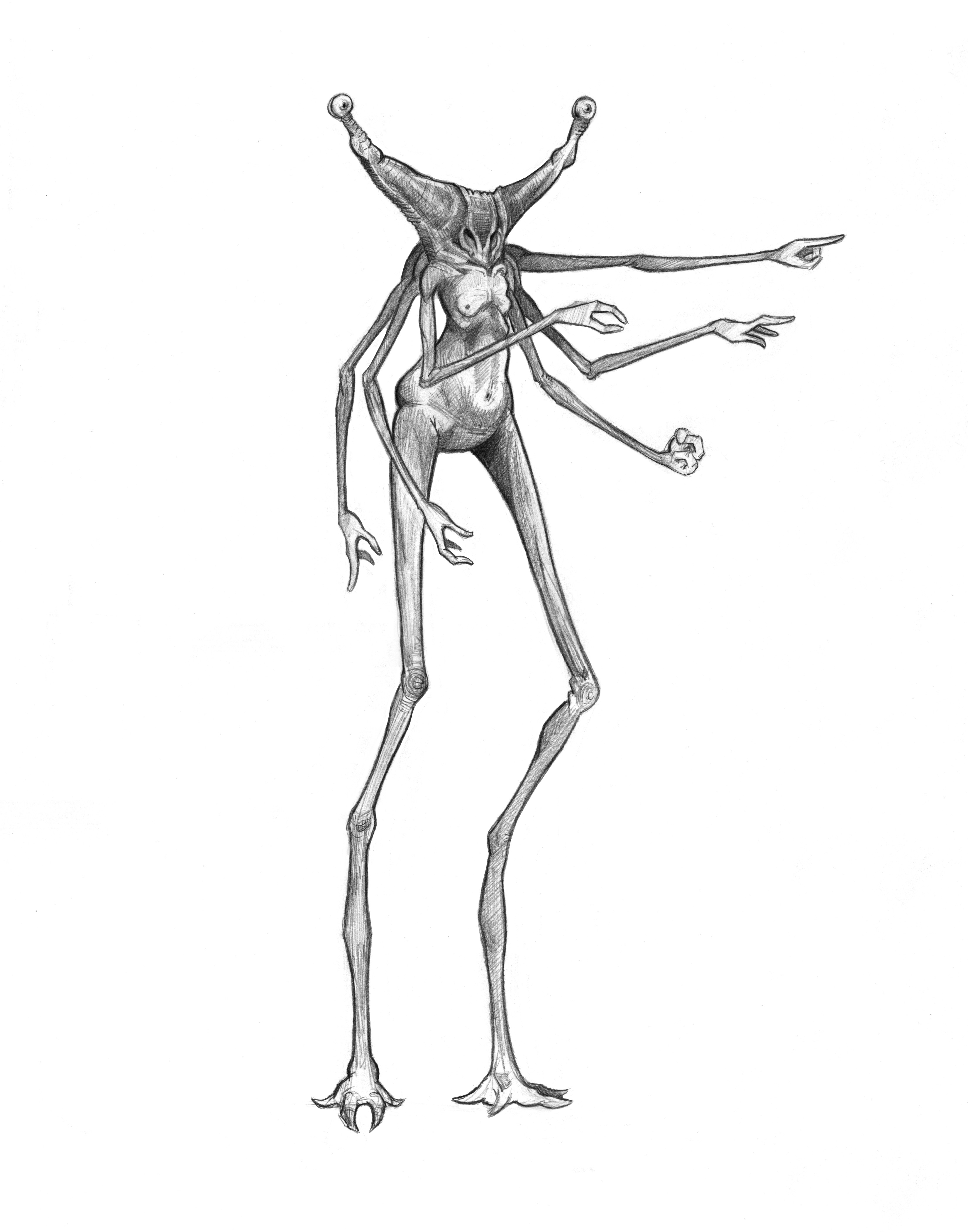 The Pointing Alien has a lot going on with its arms. Each side of its body reacts to what each of its eyes sees. It often looks confused and unsure of which direction it should go. This creature is full of energy and is always on the move.
