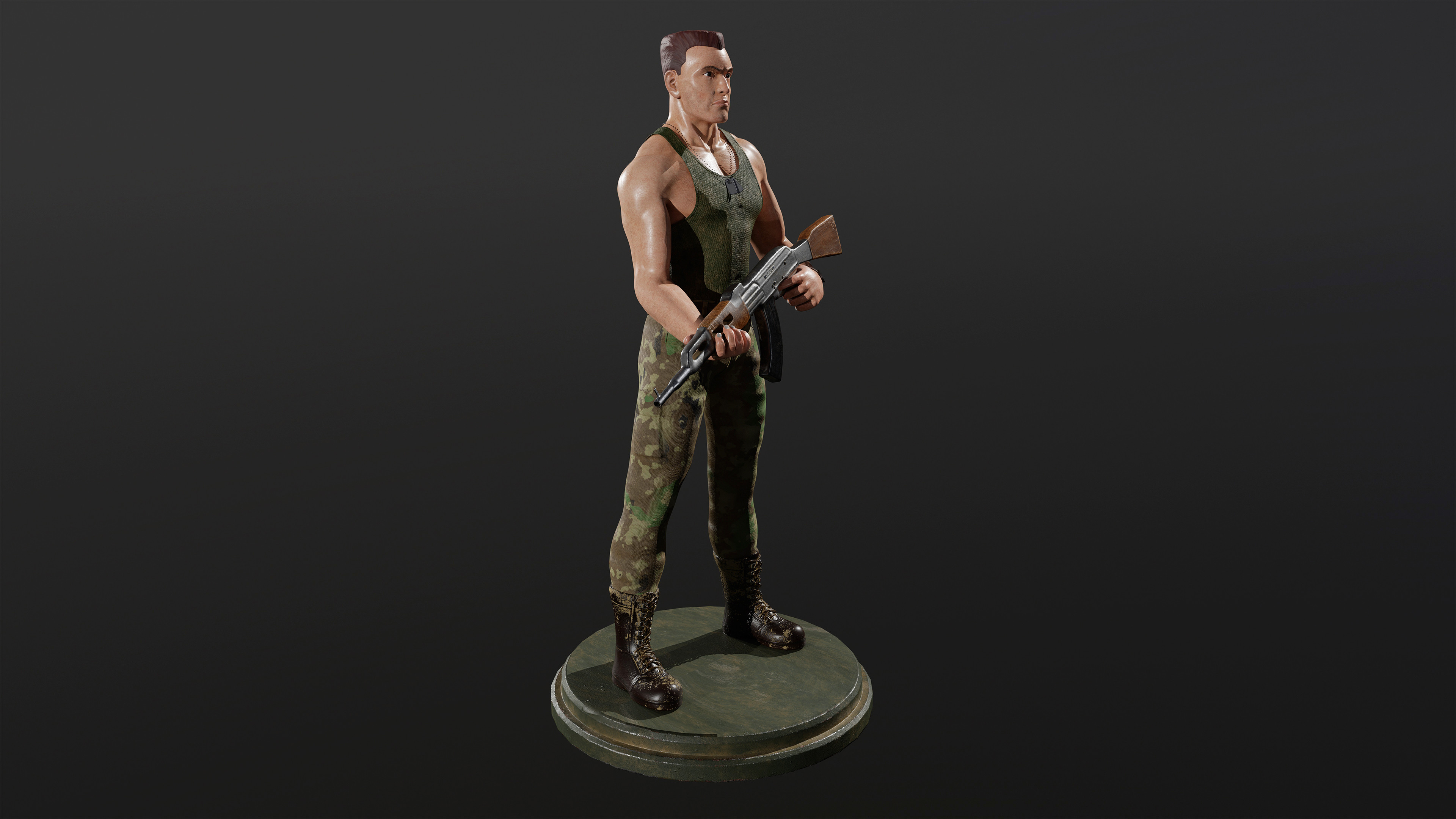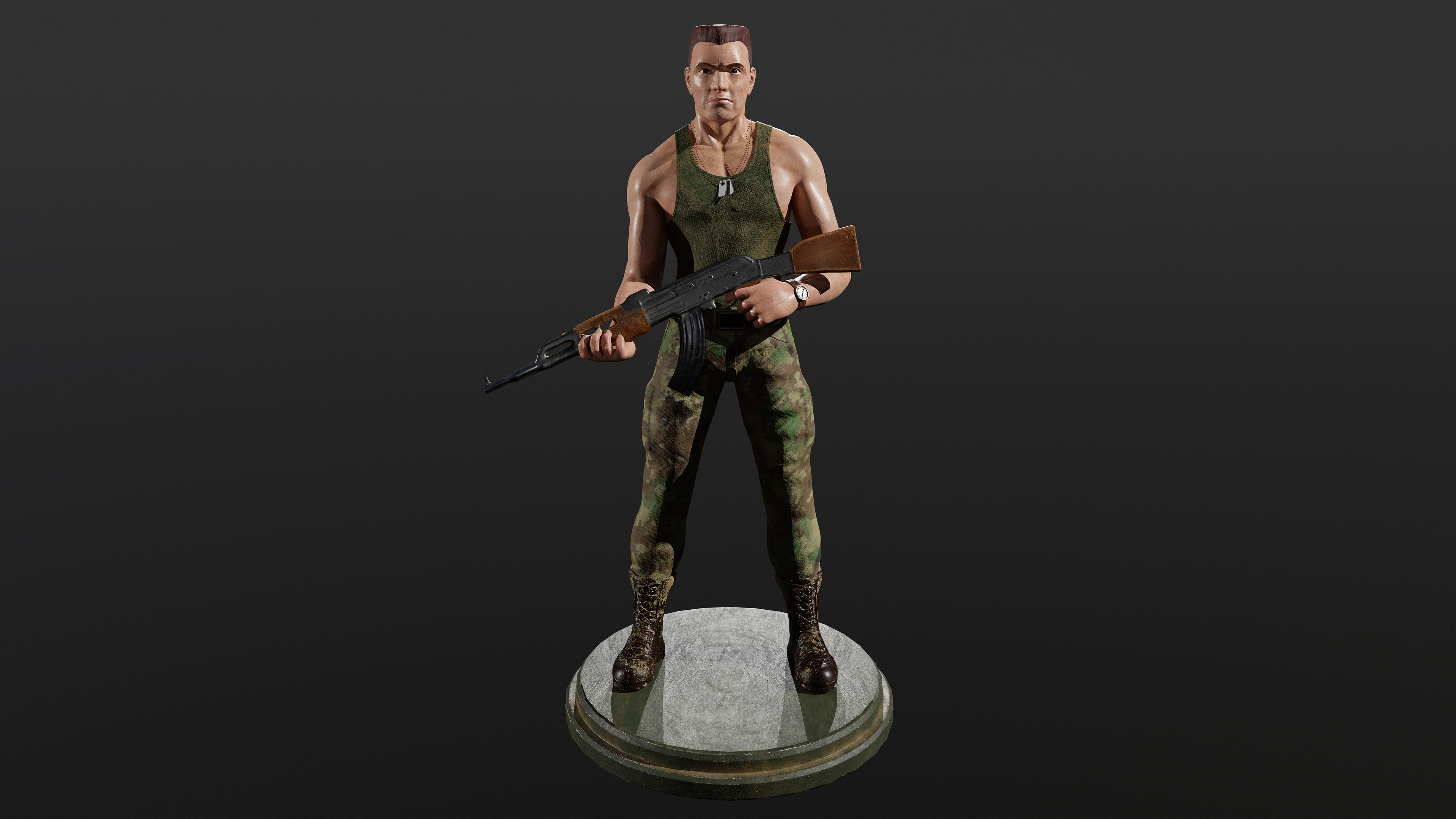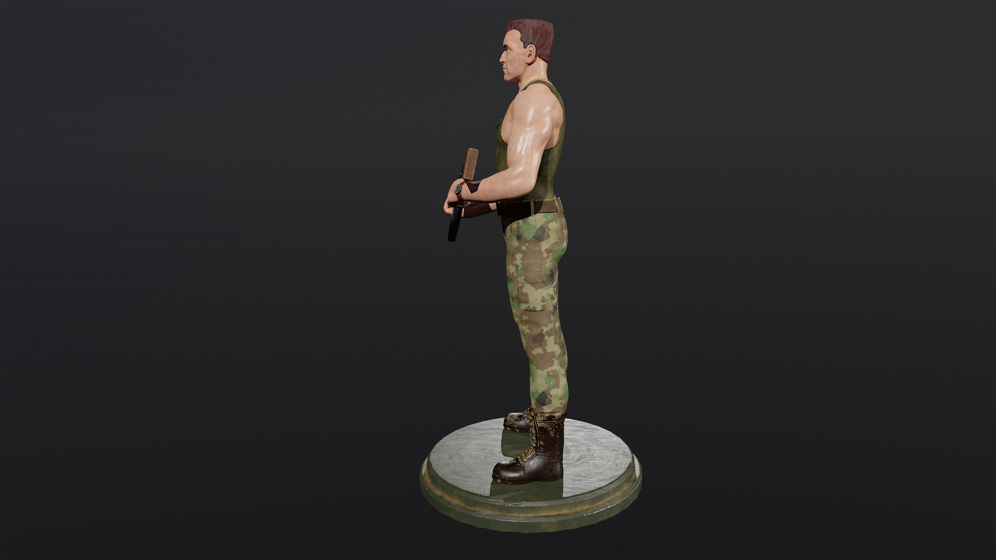 For this project, I wanted to create your basic grunt. This was my idea of a simple grunt character. Strong, stoic, and standing tall. I went for a gritty look and based his design loosely on Guile from Street Fighter. This concept was created in ZBrush without sketching any rough ideas.