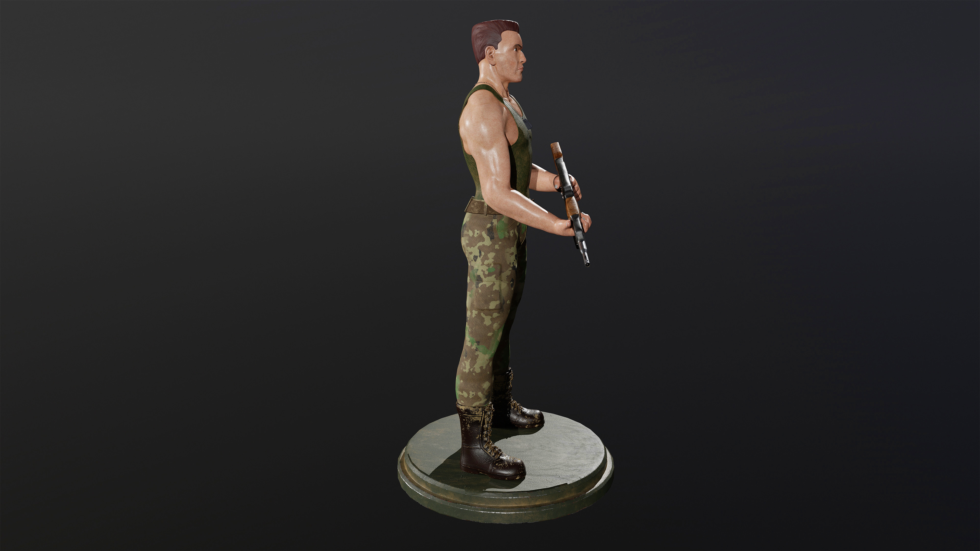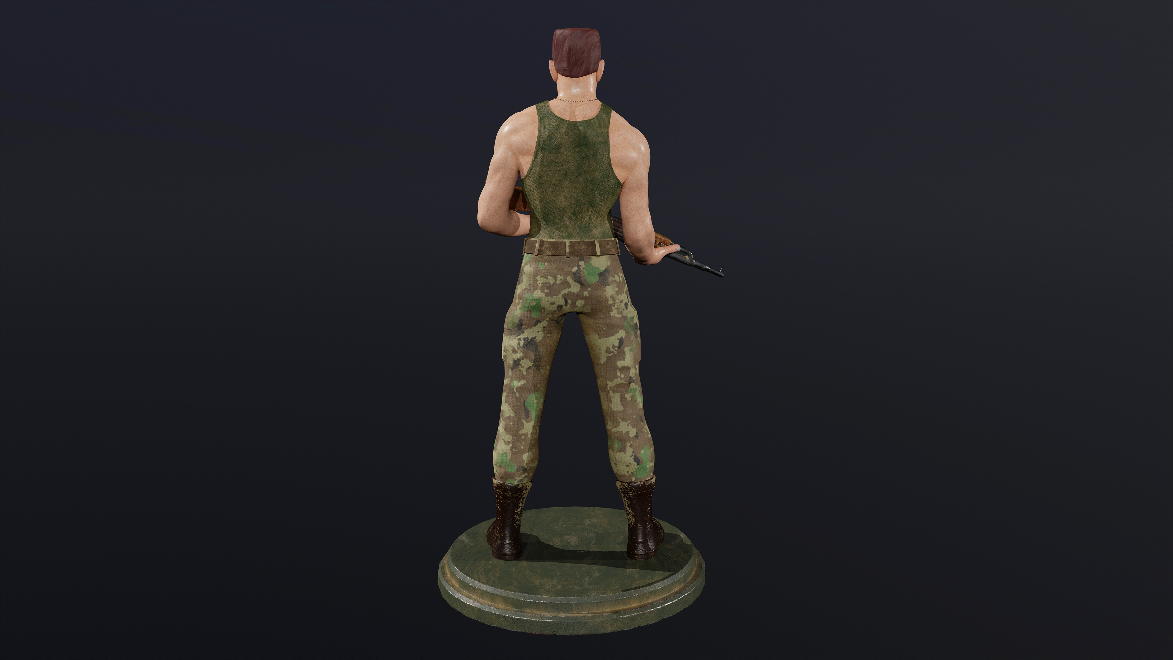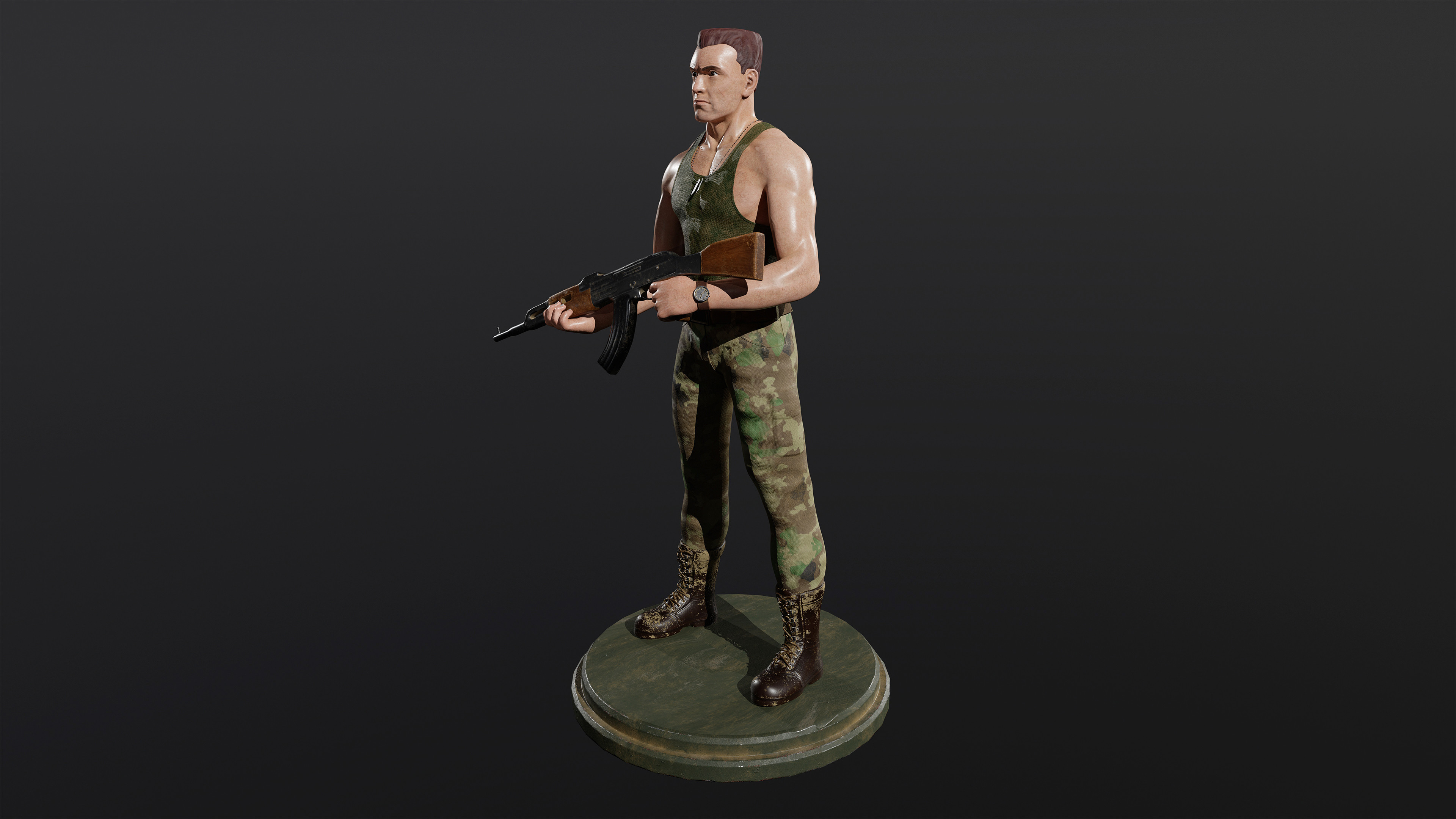 For this project, I wanted to create your basic grunt. This was my idea of a simple grunt character. Strong, stoic, and standing tall. I went for a gritty look and based his design loosely on Guile from Street Fighter. This concept was created in ZBrush without sketching any rough ideas.